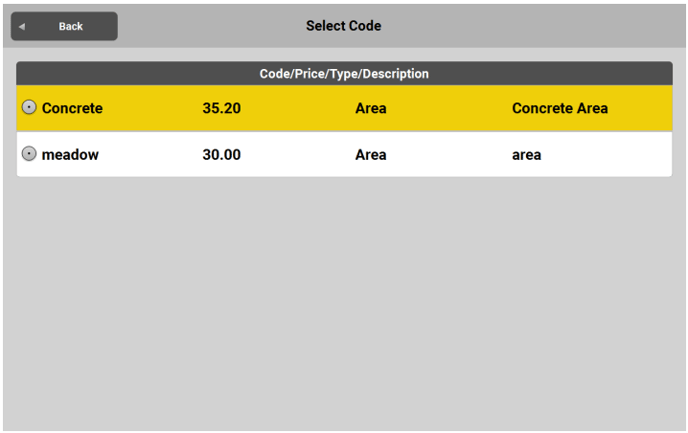 - Before measuring a feature, assign the respective code from the cost file to include the feature in the quantification process. Tap Code in the Measure bar and select a code from the list. For detailed information, refer to Defining Code for Each Stored