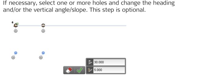 Toolbar buttons and editable fields for defining the heading and the inclination of the holes