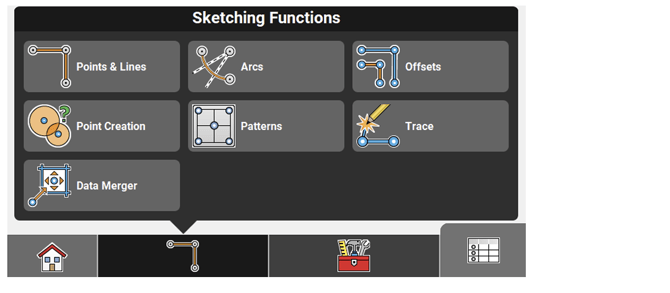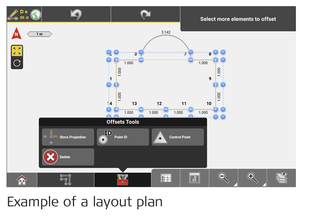 Draw/Sketching is an application that can be used without a connected instrument. Layout plans consisting of points, lines and arcs can be created, and these plans can then be used in another application to be directly staked out/laid out.