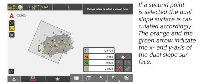 • Adjust the sloping of the surface by entering different percentage values for the slopes in x- and/or y-direction. If two points are selected the given slope along the x-axis results from the height difference between those points. The value can be changed.