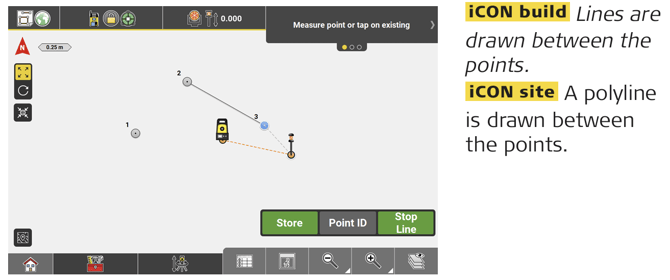 • Measure iCON site/As-Built iCON build is an application that records and displays point and line information obtained using the connected Total Station or GNSS instrument. Points, lines and arcs can be measured, recorded and displayed within the Map screen. Descriptions, codes, and IDs can be assigned to each element.
