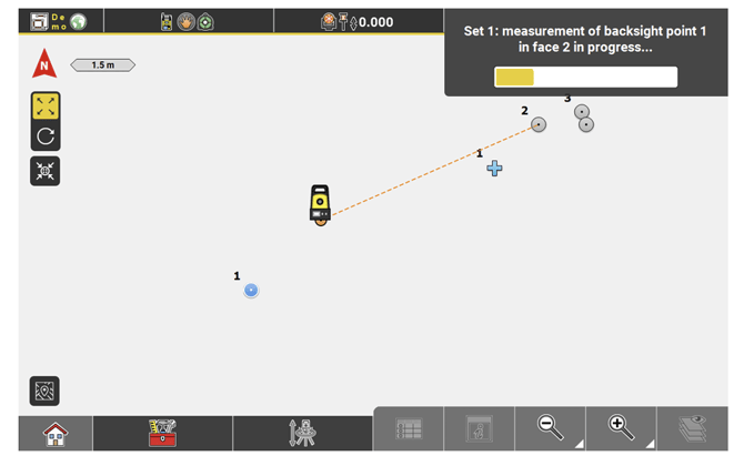 Working with a robotic total station: The instrument automatically turns to the defined points and measures them. A progress bar is displayed during the measurement process.