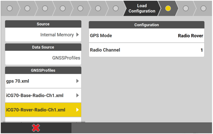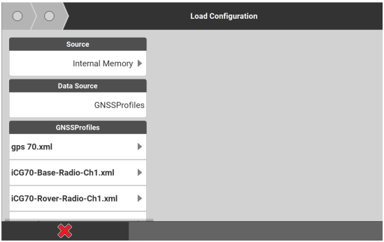 A profile can be loaded either from the internal memory, from a connected storage device or from Leica ConX. Ensure that the profile is stored within the folder GNSS Profiles, otherwise it is not available for import.
