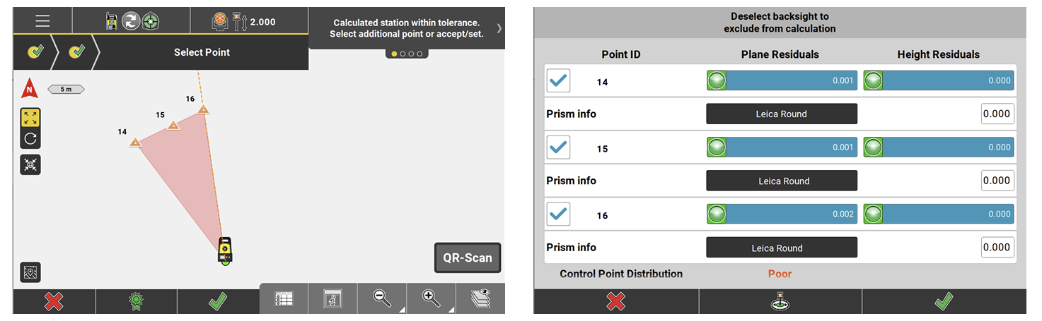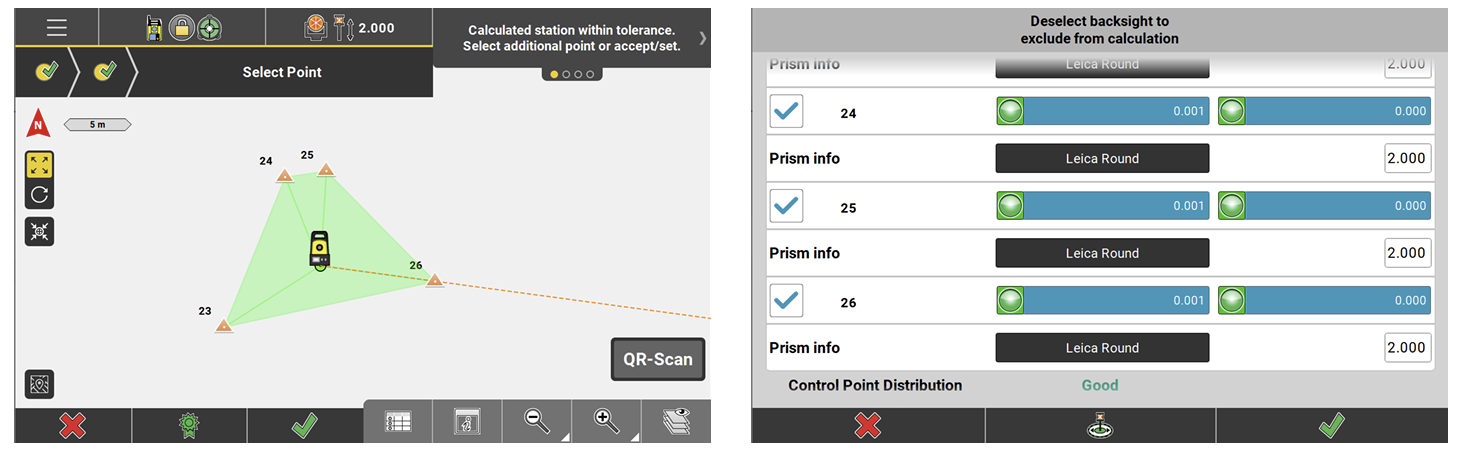 As a means of quality control for setup constellations, the angles measured between points used to create a station and the station itself are checked during setup and graphically indicated as good, if the angle between the instrument and any other two selected points is within a range of 35° to 145°.