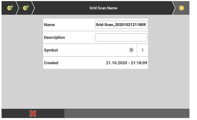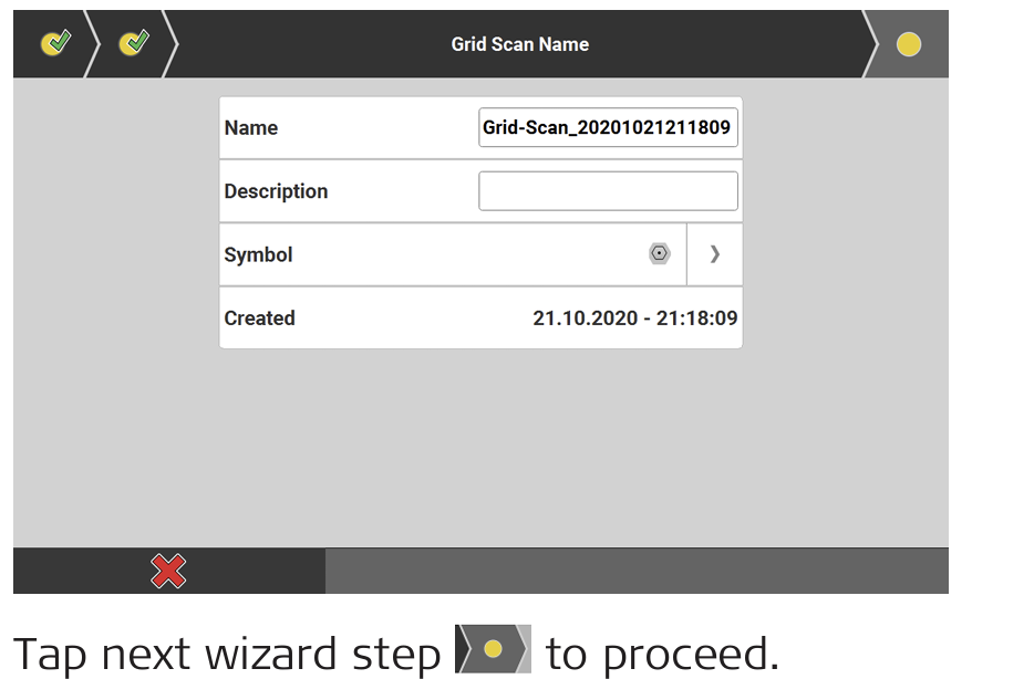 If desired, you can edit the file name of the scan data, enter a description and define the symbol for the scan points. Tap next wizard step