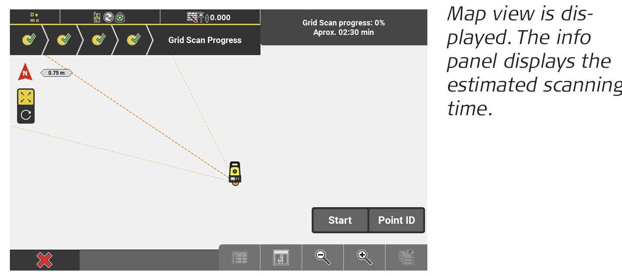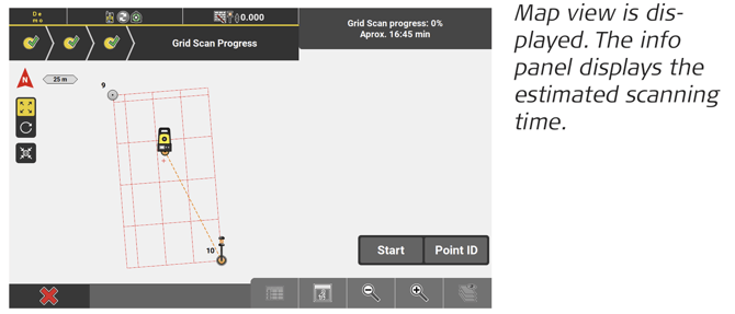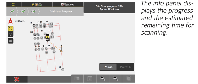 ↪ To assign a code to the scan points, tap Code. If necessary, adapt the Measure bar to display Code. - To start the scanning process, tap Start. The info panel displays the progress and the estimated remaining time for scanning.