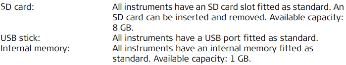 Description: Data is stored on a memory device. The memory device can be an SD card or internal memory. For data transfer an USB stick can also be used.