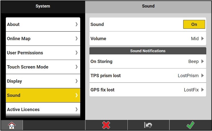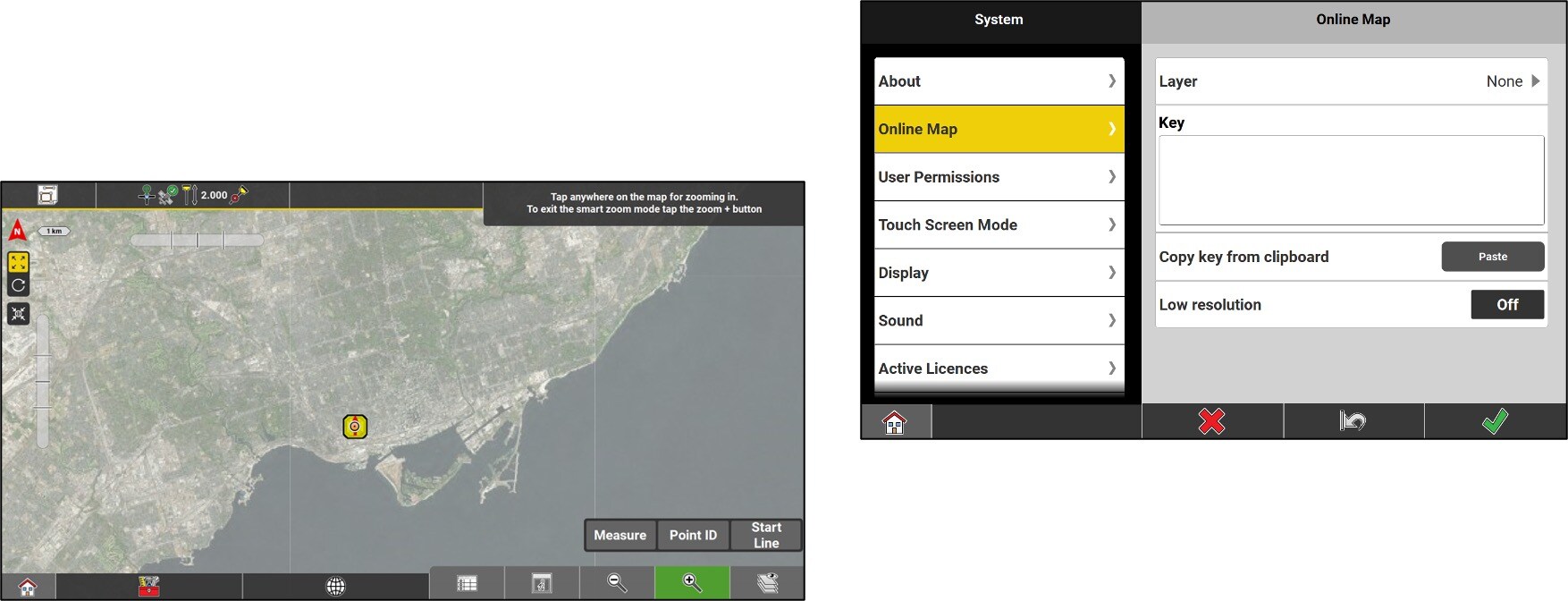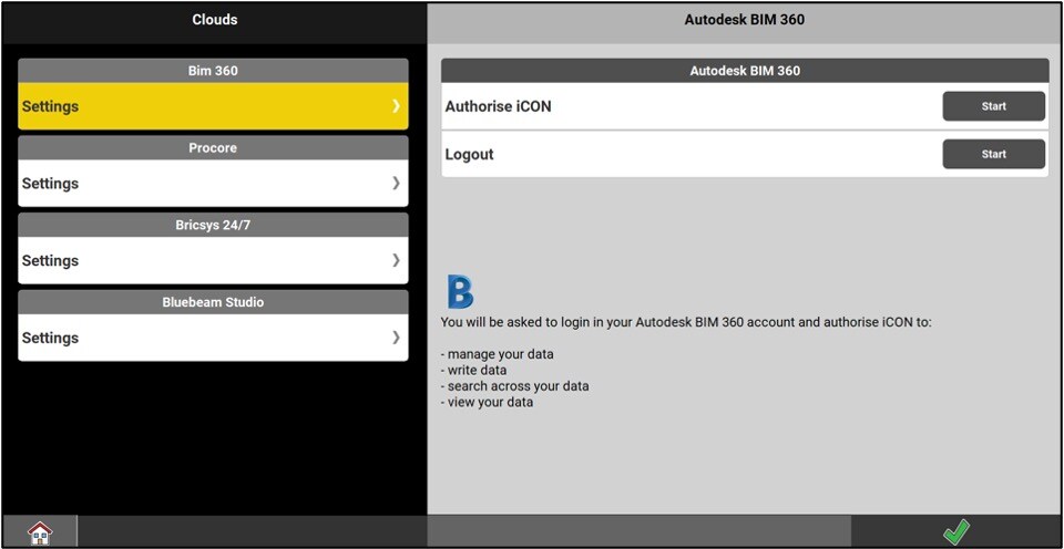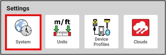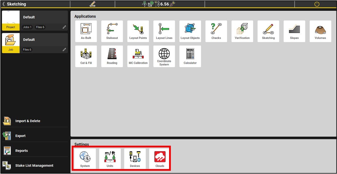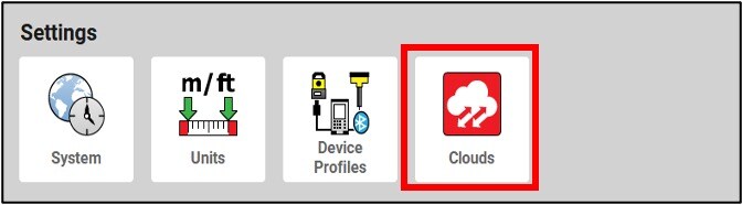 The Clouds menu provides access to remote control, as well as data transfer between the field and the office. A subscription and an internet connection are required to use these services.