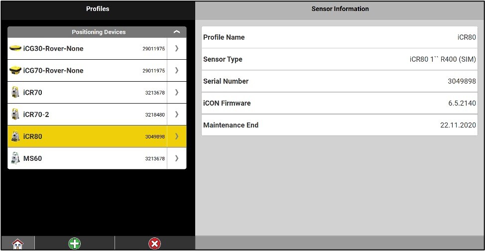Devices (profiles of GNSS sensors or total stations connected to the CC80)