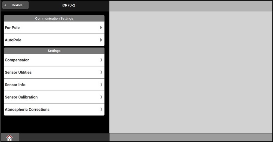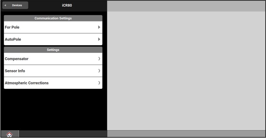 You can access the level, the software update, the instrument information, the field calibration, and the adjustment of the atmospheric corrections from the devices menu.