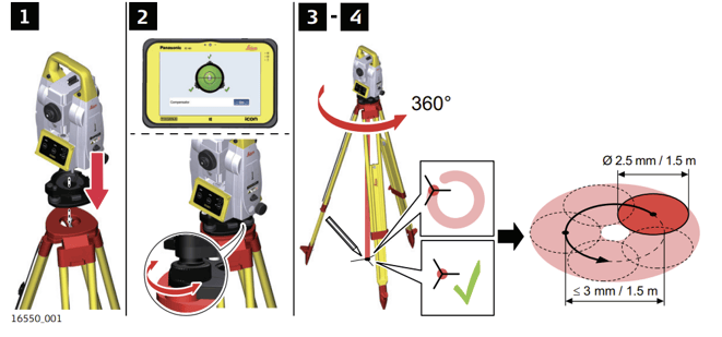 - Turn on the instrument. Connect the instrument to the field controller. Using the tribrach footscrews, level the instrument with the electronic level.