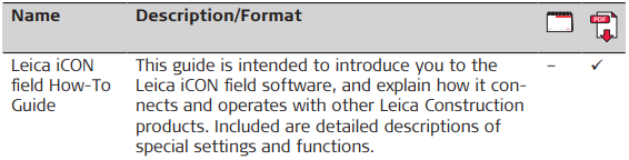 ☞ This guide is intended to introduce you to the iCON field software, and explain how it connects and operates with other Leica Construction products. It can act as a quick field reference manual, whilst also providing concise information relating to configuration, data transfer, and the functionality contained within different field applications.