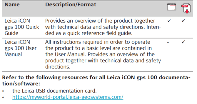 This manual applies to the Leica iCON gps 100 instrument and the Leica CGA100 antenna.