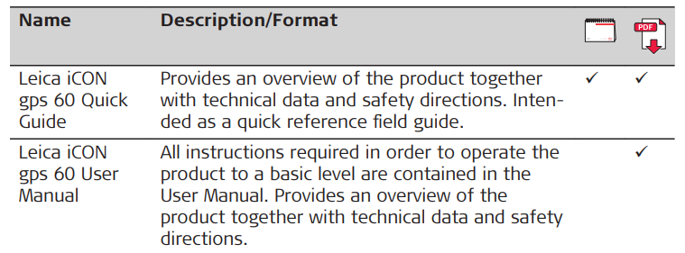Refer to the following resources for all Leica iCON gps 60 documentation/software: