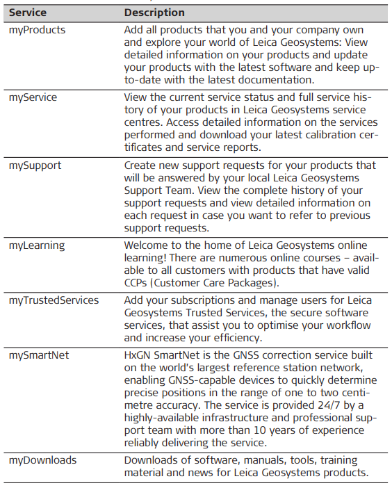 myWorld@Leica Geosystems (myWorld@Leica Geosystems) offers a wide range of services, information and training material. With direct access to myWorld, you are able to access all relevant services whenever it is convenient for you.