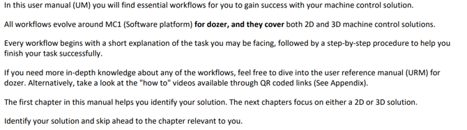 Your machine: Workflows in this chapter focus on your machine as a whole, and are relevant for both 2D and 3D machine control solutions.