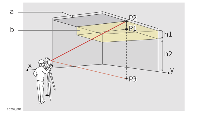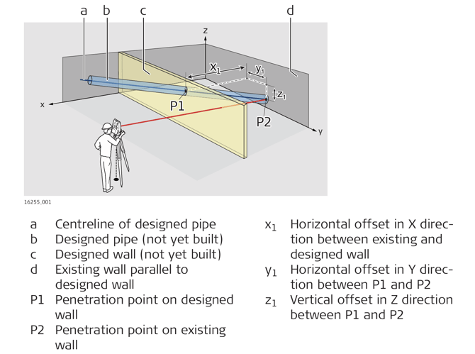 ↪ If the total station is set up by using a tilted reference plane, the following workflow can also be applied to walls, sloped planes and roofs. Refer to 6.8 Setup Using a Tilted Reference Plane .