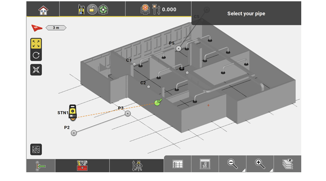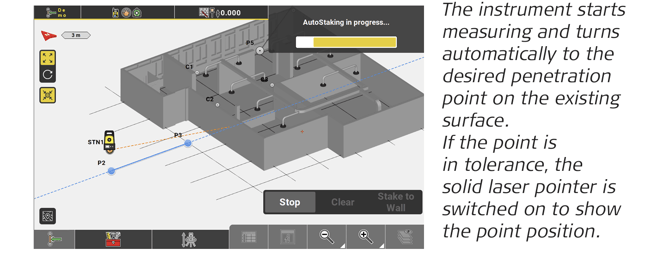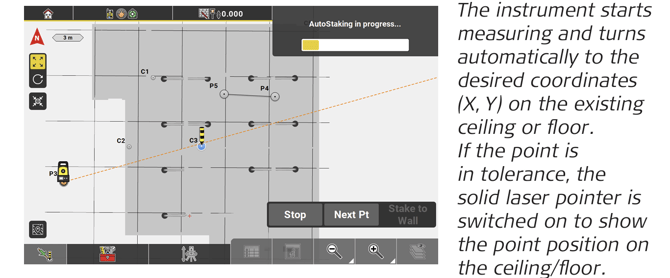 The Auto Staking tool allows you to lay out points automatically, such as points on a ceiling, floor, wall or penetration points on walls. The tool is especially intended for situations where the coordinates of the point to be laid out do not fit to the already built area.
