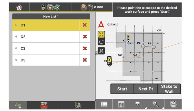 - For points on ceiling/floor: Turn the telescope to the ceiling/floor where the point shall be staked out or marked. Select the point and tap Start.