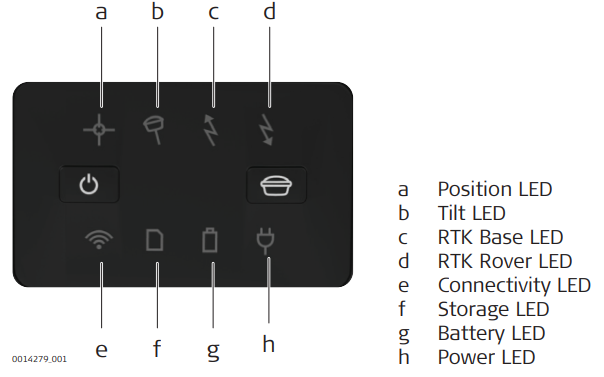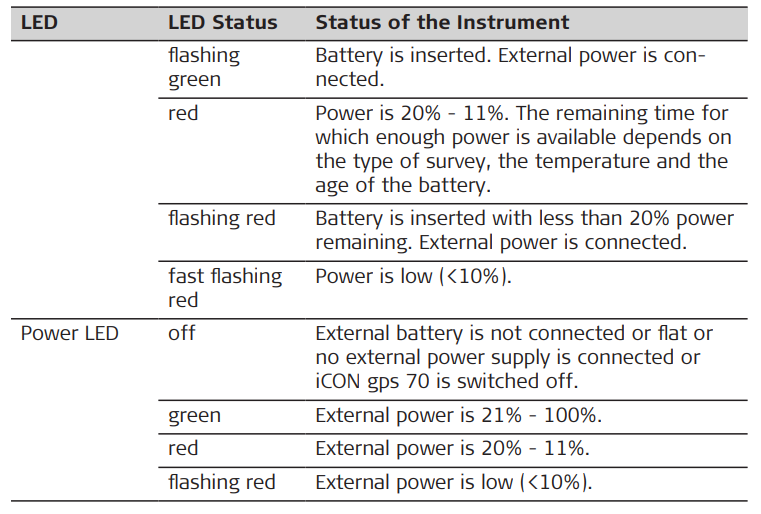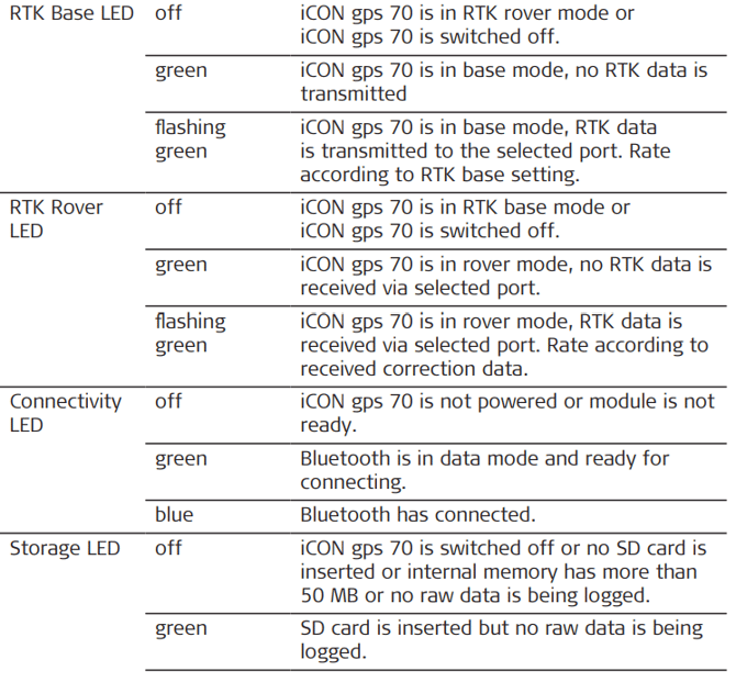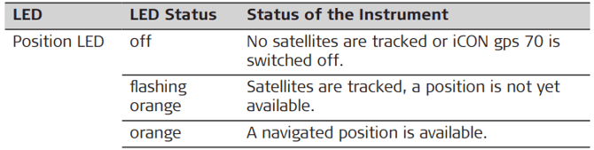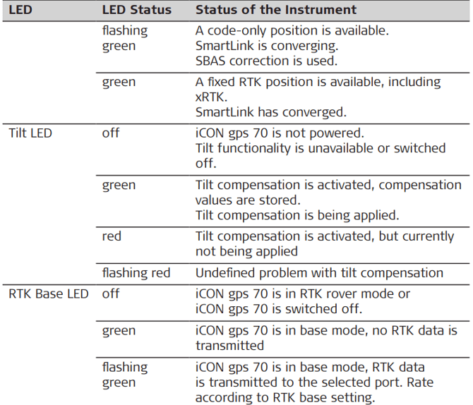The iCON gps 70 instrument has Light Emitting Diode indicators. They indicate the basic instrument status.