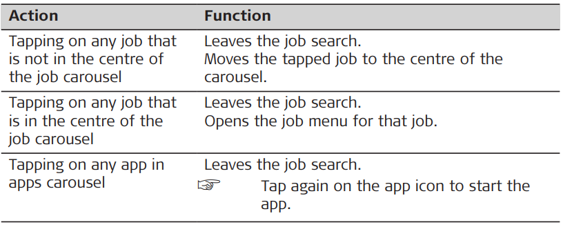 Functions in job and apps carousel when job search is active in the Leica Captivate - Home menu