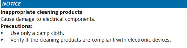 • Use only a clean, soft, lint-free cloth for cleaning. If necessary, moisten the cloth with water or pure alcohol. Do not use other liquids; these may attack the polymer components.