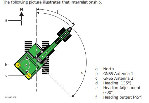• The Heading is the vector from Antenna 1 to Antenna 2 in degrees clockwise from north rather than clockwise from the vehicle reference frame.