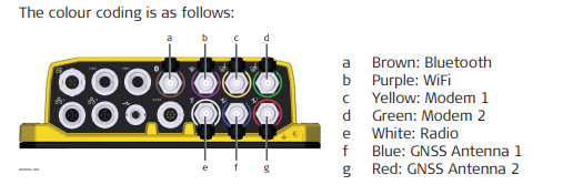 ☞ Connecting the wrong antenna to the wrong connector may damage the antennas. In order to minimise the chance of connecting the incorrect external antenna, the four TNC connectors are colour coded. Cables with corresponding colours are available.