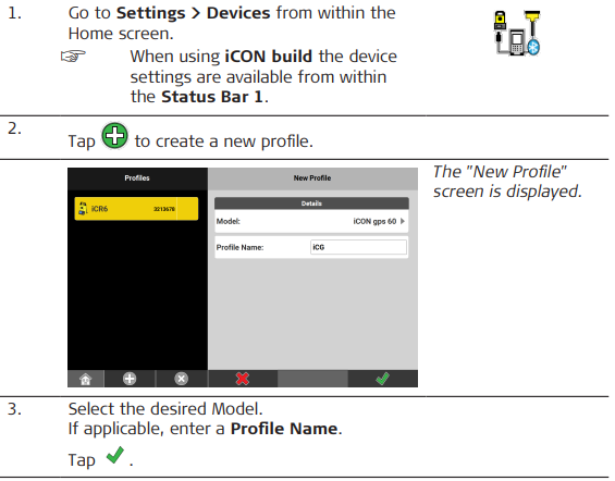 ☞ To set up a GNSS profile for the iCON iCG30/70/100/160, proceed to 2.5.4 How to set up a GNSS Profile for iCONiCG30/70/100/160. To set up a GNSS profile for the iCON iCG60 and other antenna models, proceed to 2.5.5 How to set up a GNSS Profile for iCON iCG60.