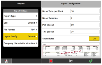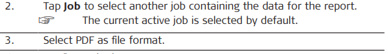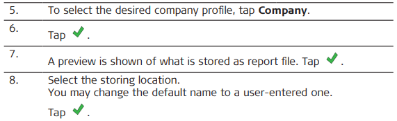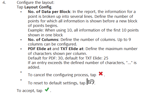For Checks and Surfaces & Volumes, the tables are shortened. Any information about prism/antenna height, codes, satellites, quality and similar is not shown. If this information is needed, create a report in another file format or create a Data Collection report.