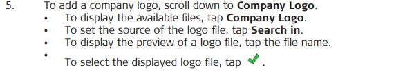 ☞ You can add a company logo as .jpeg or .png file. Save such files in the internal memory or in the root directory of a removable data storage device.