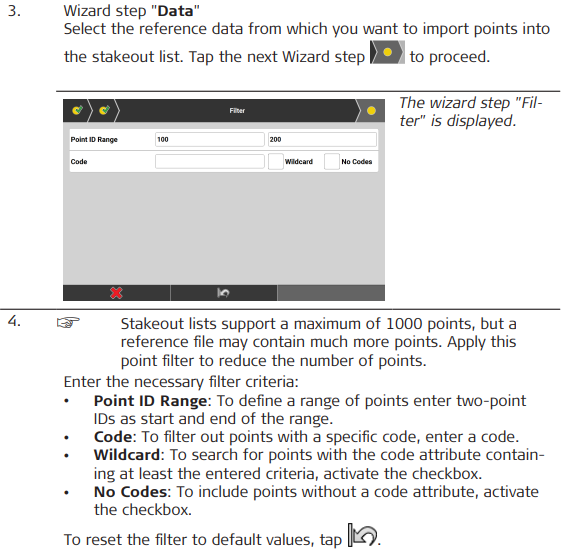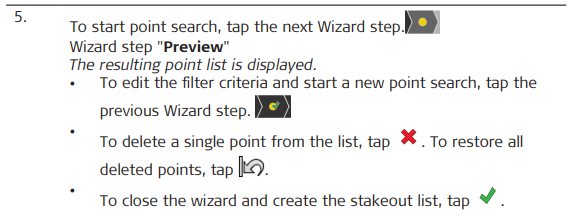 ☞ Regardless of having points selected, the Stakeout List function always adds all points in the point list to the stakeout list. To reduce the number of points to be added, use the Point search function.