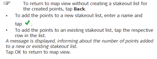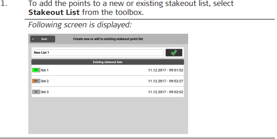 ☞ You can use the point list to add points to a new or existing stakeout list.