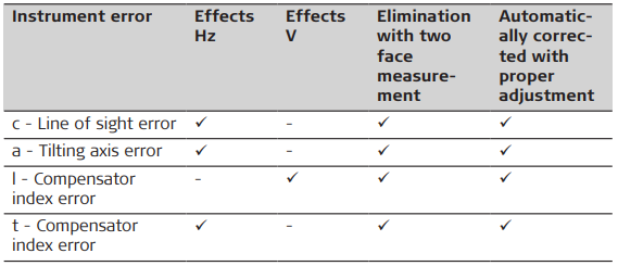 General Information: Leica Geosystems instruments are manufactured, assembled and adjusted to the best possible quality. During the manufacturing process, the instrument errors are carefully determined and set to zero. When the instrument is in use, though, and exposed to external influences, errors can increase and it is highly recommended to redetermine them in the following situations