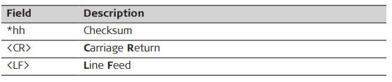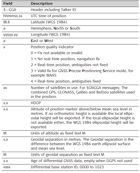 Syntax: $--GGA,hhmmss.ss,llll.ll,a,yyyyy.yy,a,x,xx,x.x,x.x,M,x.x,M,x.x,xxxx*hh
