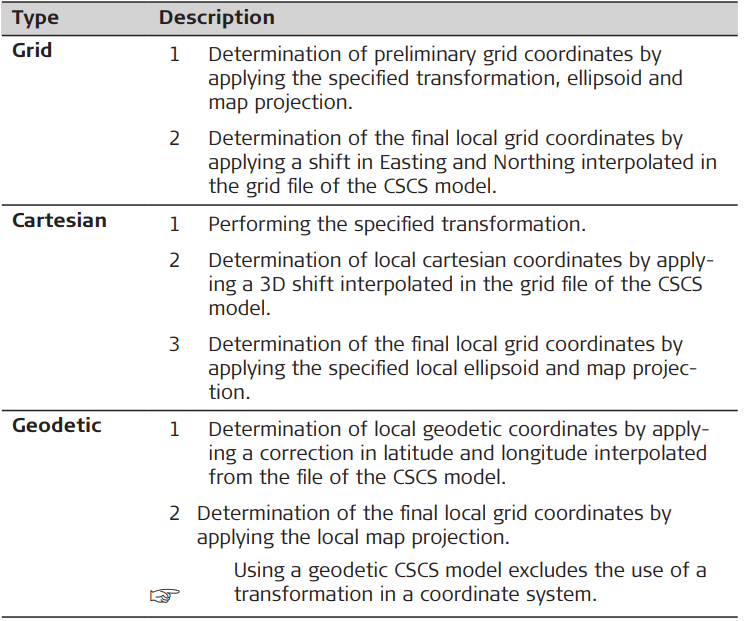 Types of CSCS models: The correction values of a CSCS model can be applied at different stages in the coordinate conversion process. Depending on this stage, a CSCS model works differently. Three types of CSCS models are supported. Their conversion process is as explained in the following table. Any suitable geoid model can be combined with a geodetic CSCS model.