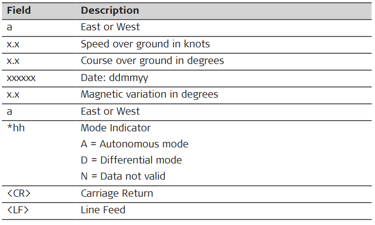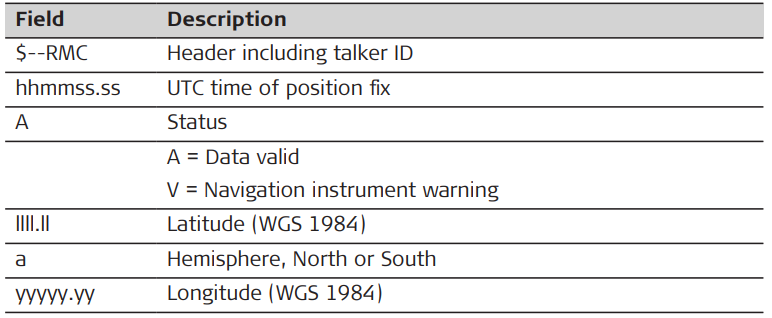 Syntax: $--RMC,hhmmss.ss,A,llll.ll,a,yyyyy.yy,a,x.x,x.x,xxxxxx,x.x,a,a*hh<CR><LF>