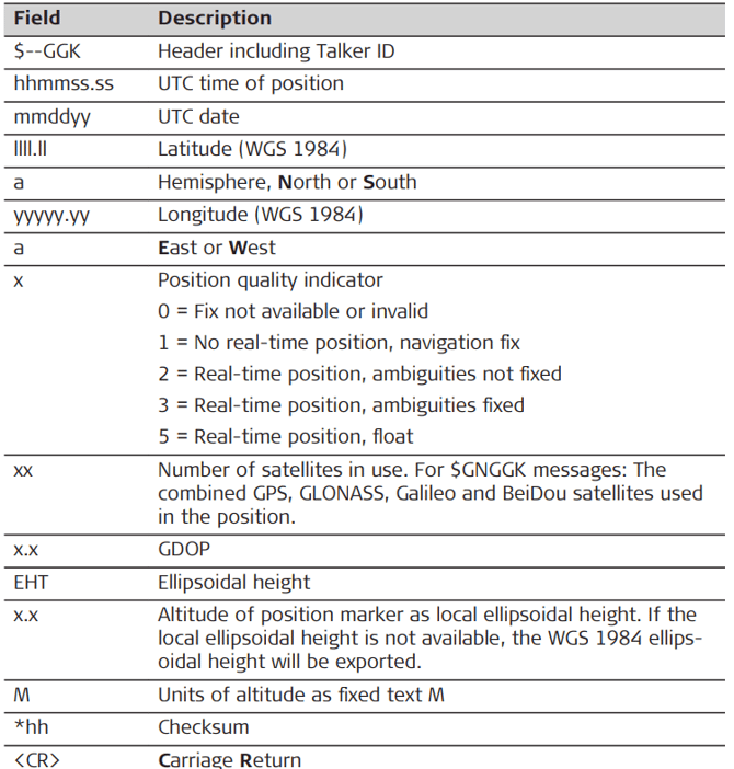 Syntax: $--GGK,hhmmss.ss,mmddyy,llll.ll,a,yyyyy.yy,a,x,xx,x.x,EHTx.x,M*hh<CR><LF>