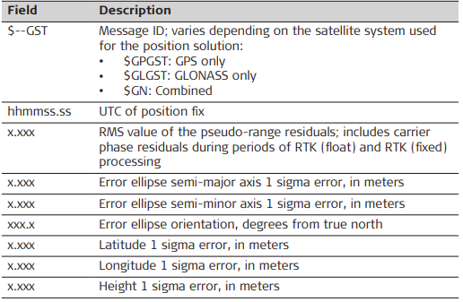 A.10 GST - Position Error Statistics Syntax: $--GST,hhmmss.ss,x.xxx,x.xxx,x.xxx,xxx.x,x.xxx,x.xxx,x.xxx*hh Description of fields Examples Standard Talker ID$GNHDT,11.4,T, 00*4B
