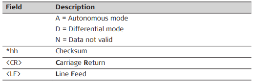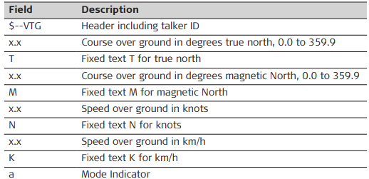 Syntax: $--VTG,x.x,T,x.x,M,x.x,N,x.x,K,a*hh<CR><LF>
