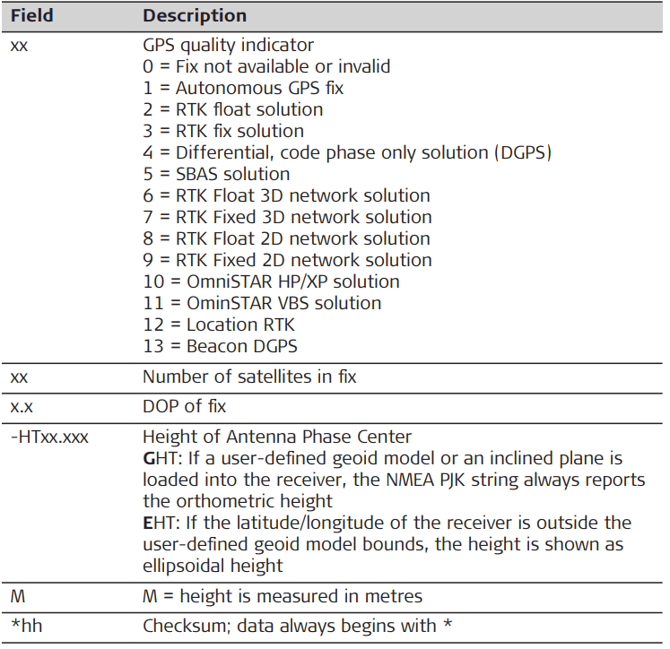 ☞ If the receiver does not have a coordinate system loaded, this string returns nothing in fields nnnnnn.nn,N,eeeeee.ee,E and -HTxx.xxx.