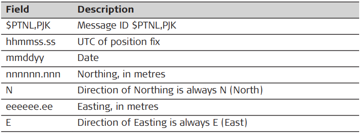 Syntax: $PTNL,PJK,hhmmss.ss,mmddyy,nnnnnn.nnn,N,eeeeee.ee,E, xx,xx,x.x, HTxx.xxx,M*hh