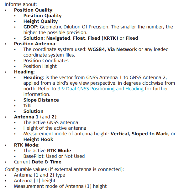 ☞ Information about Antenna 2 as well as Heading is only valid for the iCG82 instrument with installed Dual positioning and Heading licence, when both GNSS antennas are connected and have a clear view of the sky.