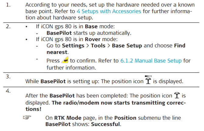 ☞ When using BasePilot, always check in the Position submenu that the iCON gps 80 has selected the correct base point! Using the wrong base point can lead to an error of more than 20 m for a rover!