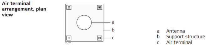 Protection by air terminals is recommended. An air terminal is a pointed solid or tubular rod of conducting material with proper mounting and connection to a conductor. The position of four air terminals can be uniformly distributed around the antenna at a distance equal to the height of the air terminal.