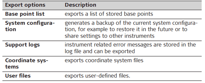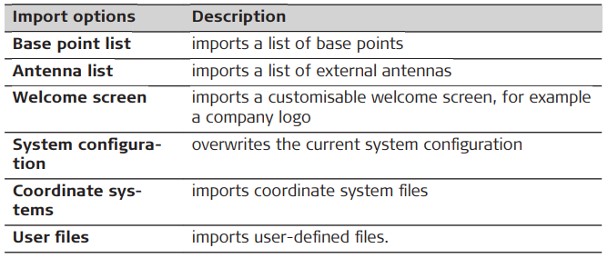 ☞ To import data from a USB Memory device to the instrument appropriate folders must be created on the USB device and the files placed in the correct folder: for Coordinate Systems a folder called CoordinateSystems is needed, for User files a folder called User is needed, while files for Base Point list, Antenna list, Welcome Screen, and System Configuration need to be placed in a system folder.