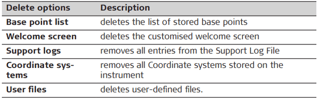 Delete data on the instrument: Select Settings > Tools > Import / Export / Delete > Delete on instrument to delete data from the instruments internal memory.