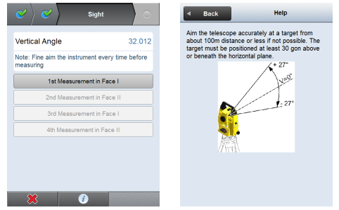 • Aim the telescope accurately at a target at about 50 m distant or less if not possible. The target must be positioned at least 27°/30 gon above or beneath the horizontal plane.