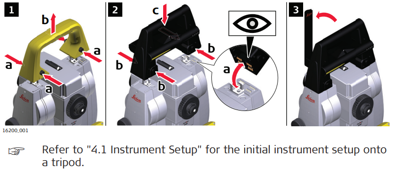 ☞ Ensure that there is a tight fit with the instrument after releasing the push buttons. If no connection can be found, re-check that handle is seated firmly. - Swing the antenna of the CommunicationHandle into an upright position.