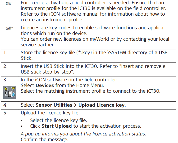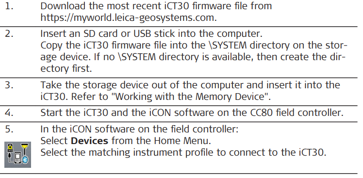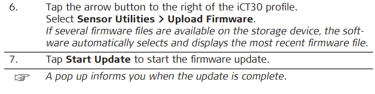 ☞ For the update process, a CC80 field controller is needed. Updating software can take some time. Ensure that the battery is at least 75% full before beginning the update, and do not remove the battery during the update process. Ensure that an instrument profile for the iCT30 is available on the field controller. Refer to the iCON software manual for information about how to create an instrument profile.